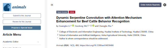 近日,永利官网yl7703永利官网青年教师李广博在《animals》期刊(SCI,JCR一区,IF: 3.0)在线发表了题为《Dynamic Serpentine Convolution with Attention Mechanism Enhancement for Beef Cattle Behavior Recognition》的研究论文。